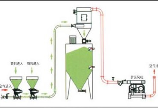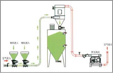 工作過程:開啟負(fù)壓引風(fēng)機(jī),將吸料管放置需要輸送的物料中,設(shè)備開始吸料,通過脈沖收塵器,將物料收集,排放到料倉。